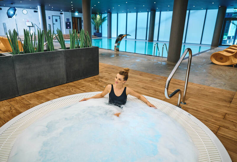 Hotel with a pool in Krakow – a relaxed model enjoying a moment of tranquility.